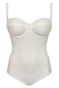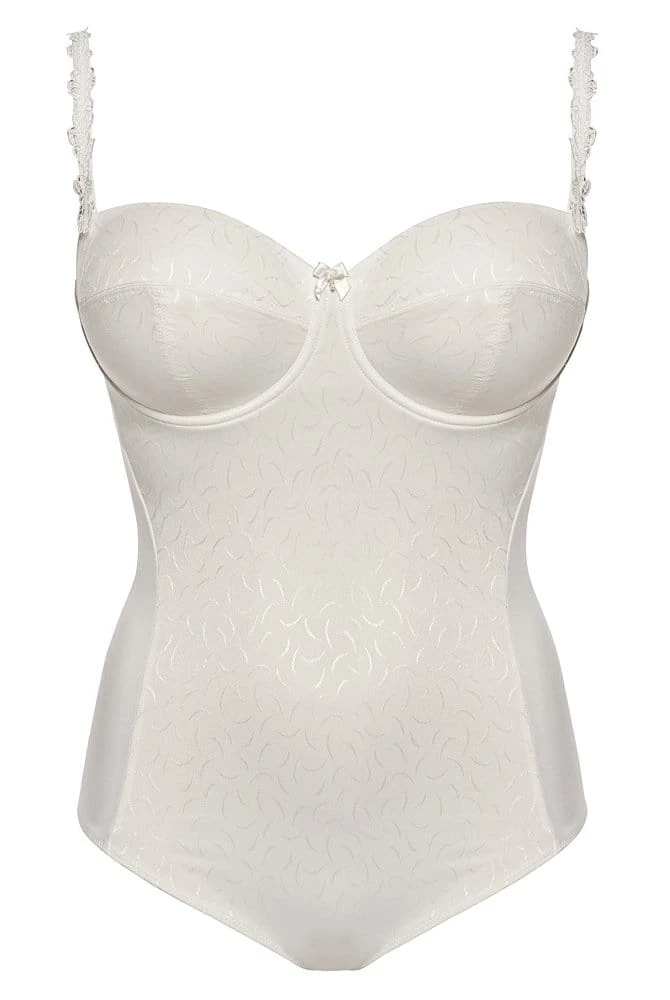 Balconette Body mit Stickerei und verzierten Außenträgern. Das dreigeteilte Schaumcup ist überzogen mit feinstem Jacquard. Die vordere Mitte des Bodys ist mit Tüll unterlegt und der Beinabschluss ist flach verarbeitet. Es werden Klarsichtträger und ein Neckholderträger mitgeliefert, die anstelle des Schmuckträgers verwendet werden können. Der Body sollte nicht ohne Träger getragen werden. Der ergonomisch geformte Bügel wird durch ein besonders weiches Bügelband abgepolstert.